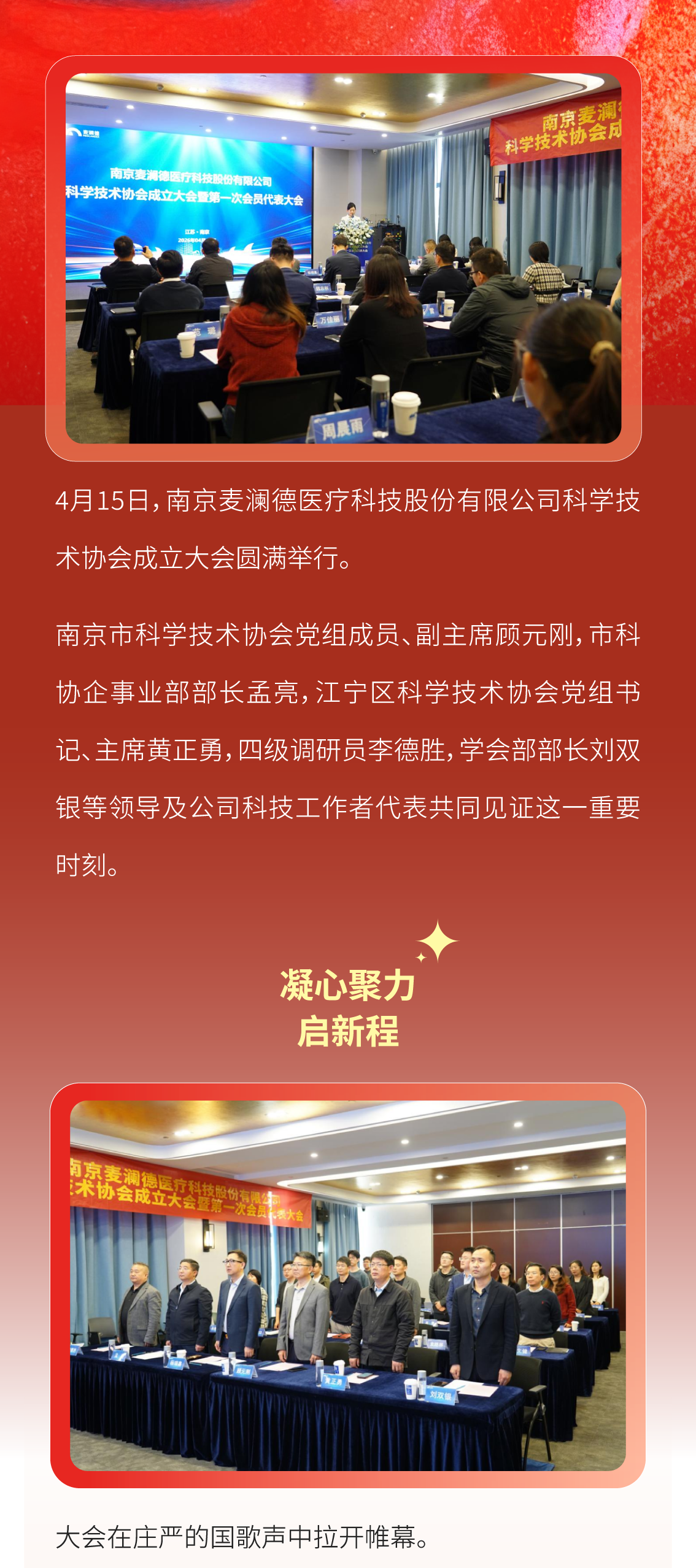 4月15日,南京麦澜德医疗科技股份有限公司科学技术协会成立大会圆满举行。南京市科学技术协会党组成员、副主席顾元刚,市科协企事业部部长孟亮,江宁区科学技术协会党组书记、主席黄正勇,四级调研员李德胜,学会部部长刘双银等领导及公司科技工作者代表共同见证这一重要时刻。